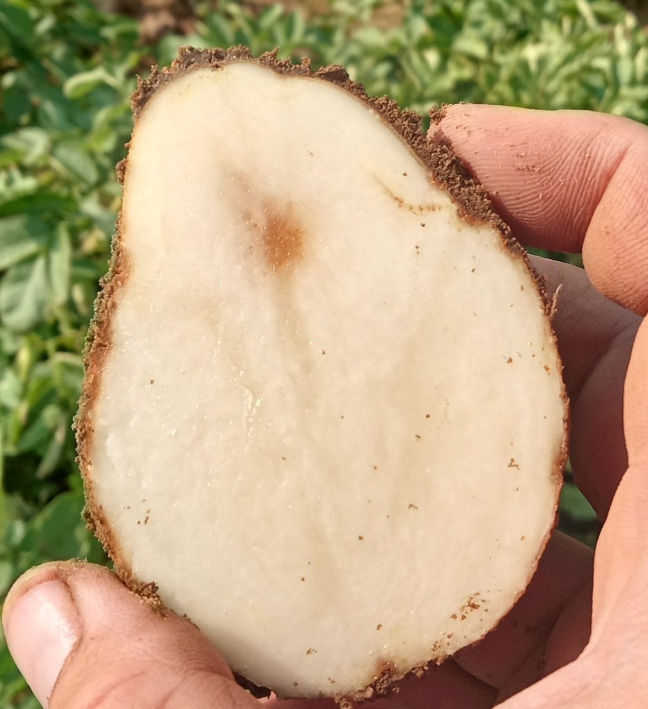Les chantiers de défanage pour la récolte principale se terminent ou se poursuivent selon la région et le producteur. Certains profitent de conditions plus favorables pour le faire, avant la venue de plus de chaleur entre autres. L'entrée de tubercules pour l’entreposage à plus long terme a débuté récemment dans certains secteurs plus au sud. Des parcelles à vocation plus tardive présentent encore du feuillage actif pour certains cultivars dans certaines régions (mais pas partout) et selon la régie de production réalisée en cours de saison (irrigation, fertilisation, rotation, santé du sol). On peut mentionner les variétés 'Caribou', 'Reveille', 'Highland', 'Mountain Gem' et 'Maritime Russet' notamment. Des producteurs prévoient défaner plus tard ces parcelles afin de maximiser le remplissage des tubercules. Concernant les rendements pour la récolte principale, les relevés réalisés par des collaborateurs sont encore préliminaires. Des premiers rapports annoncent une grande variabilité en province. De bonnes familles sont remarquées par endroits, avec un calibre parfois moyen présentement et variable selon le cultivar. Concernant la qualité des tubercules, cela demeure également variable selon la région et le cultivar. Certains défauts sont rapportés, dont du cœur creux, des fissures et craquelures de croissance, de la gale commune, de la difformité et plus de brunissement interne que la normale, en particulier dans des sols à texture plus légère (voir photo). Il est donc recommandé aux producteurs de bien vérifier la qualité interne et externe des tubercules récoltés avant l'entreposage pour bien les gérer au besoin.