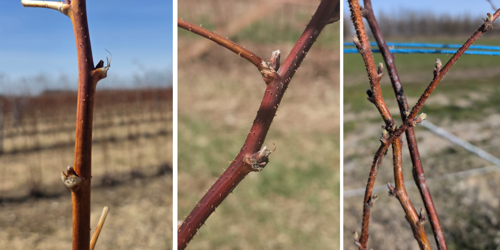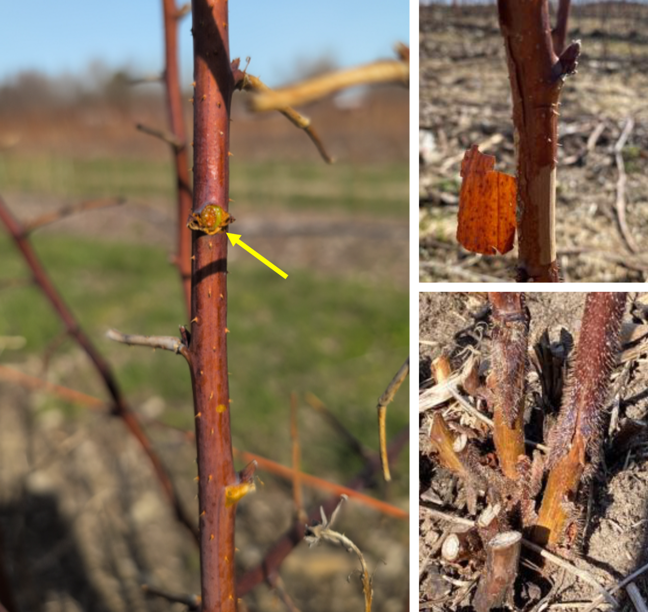 De façon générale, peu de gel ou de dégâts hivernaux sont rapportés jusqu'à maintenant. On mentionne quelques cas mineurs de gel de bourgeons ou d'écorce soulevée (voir photos plus bas). Le soulèvement de l'écorce peut avoir différentes causes, mais il est souvent dû à une alternance rapide de froid et de chaud lors de redoux hivernaux, ce qui amène une tension dans l'écorce et un fendillement, surtout à la base des cannes.