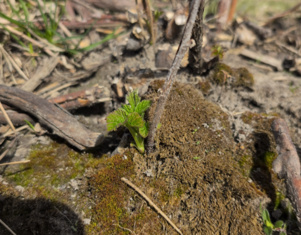 Repousses du framboisier d'automne 'Pathfinder' le 28 avril 2026 au Centre-du-Québec