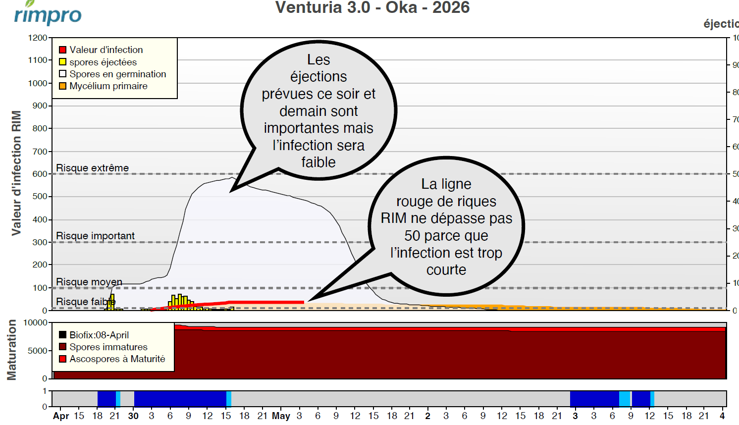 Selon le modèle prévisionnel de CIPRA consulté le 29 avril 2026, le stade « pré-bouton rose » (cv. 'McIntosh') sera atteint entre aujourd’hui (29 avril) et le début de la semaine prochaine (4 mai) en Montérégie-Ouest. Le stade « bouton rose » est également prévu pour la semaine prochaine pour cette région à partir du 7 mai.