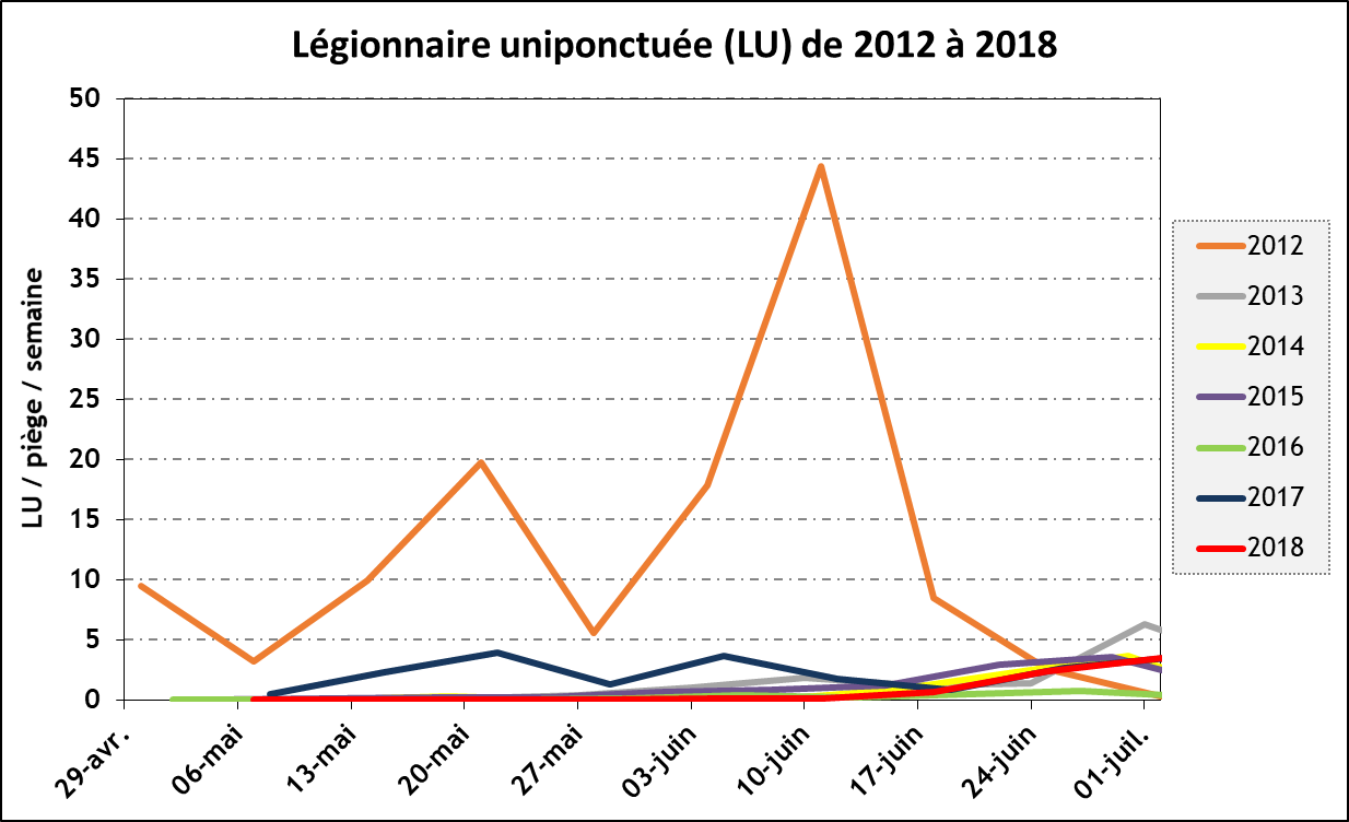 Jusqu’à maintenant, les captures sont très faibles (cliquez ici pour consulter le graphique des captures hebdomadaires en comparaison avec celles des années précédentes), à l’exception de trois sites où des captures plus importantes ont été obtenues : à Saint-Blaise-sur-Richelieu (Montérégie-Ouest), à Palmarolle (Abitibi) et à Duhamel (Témiscamingue).