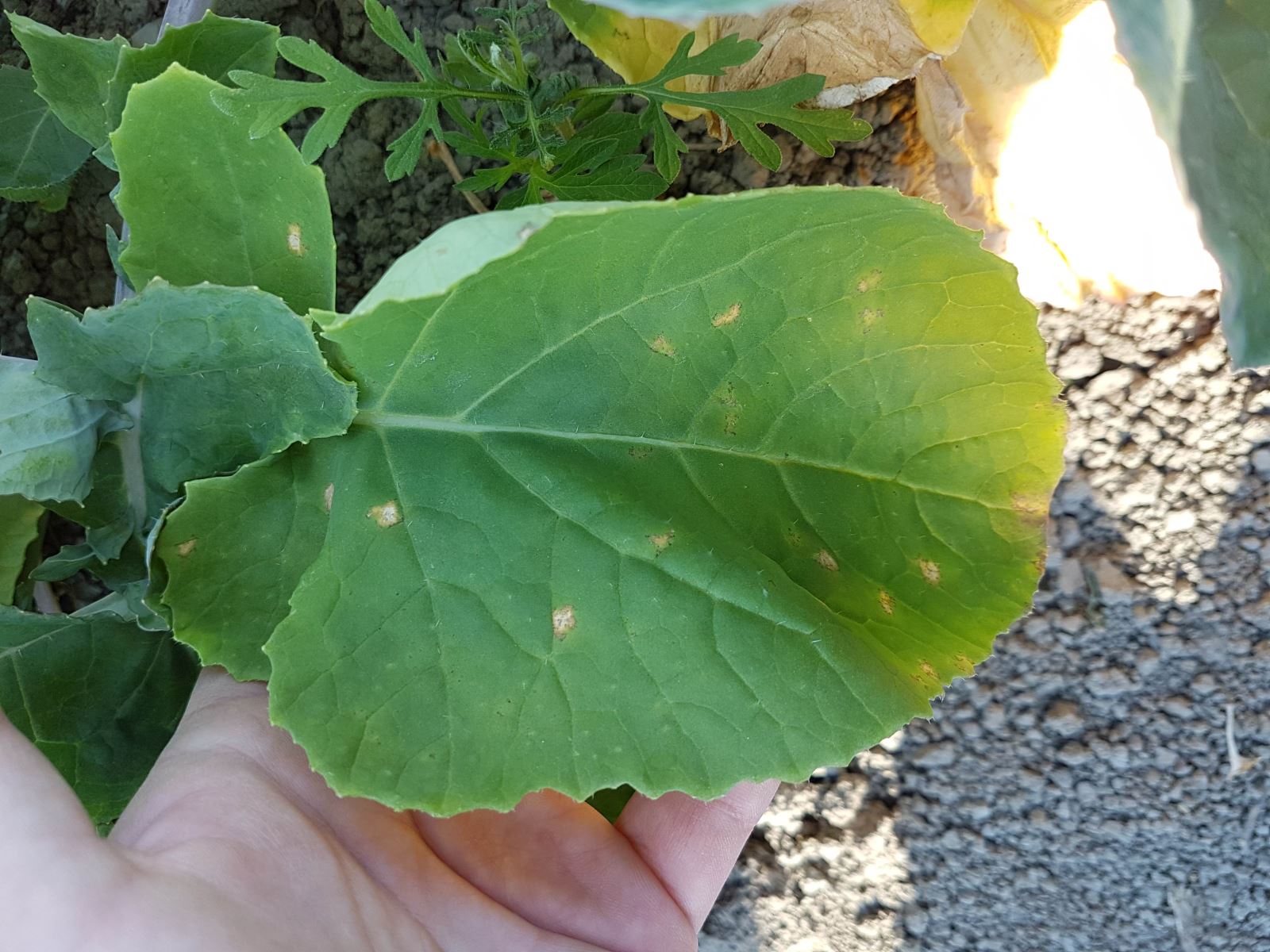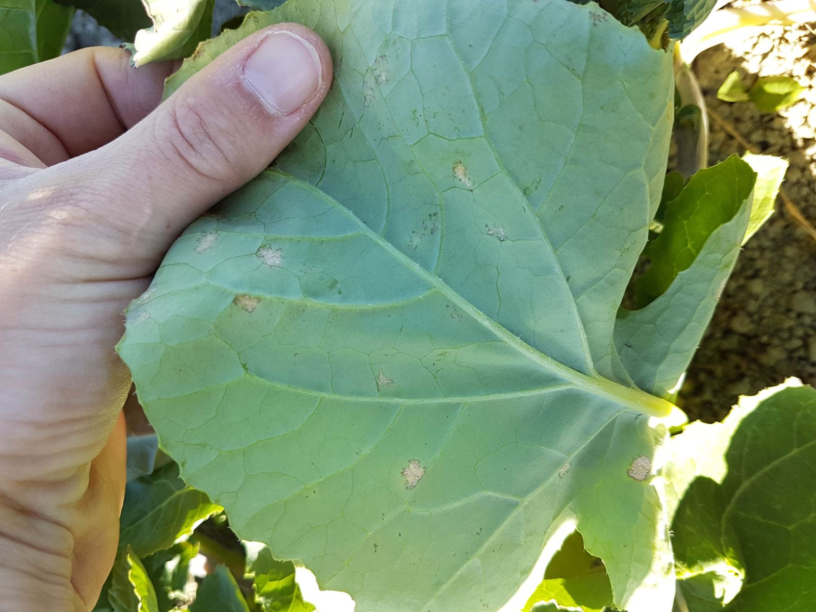 Des symptômes induits par la hernie des crucifères sont observés dans les régions de la Capitale-Nationale, de Lanaudière et des Basses-Laurentides. De plus, les premières observations de taches alternariennes ont été rapportées dans le chou pommé et le chou chinois (sur les vieilles feuilles) en Montérégie et dans les Basses-Laurentides. Ces taches sont causées par des champignons (Alternaria brassicae et Alternaria brassicicola) qui sont présents dans le sol, sur les graines et les débris végétaux. Le vent, la pluie, la machinerie, les travailleurs et les animaux sont des facteurs pouvant favoriser la dissémination des spores de ces champignons. Enfin, de la tache bactérienne (Xanthomonas campestris pv. armoraciae) est observée par endroits dans les cultures de crucifères-feuilles.