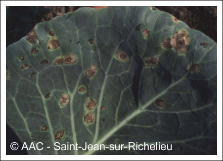 Nom scientifique: Alternaria brassicicola (Schwein.) Wiltshire Nom commun: Tache noire Nom anglais: Black leaf spot Groupe d'ennemis: Mycose Photographié par: Léon Tartier
