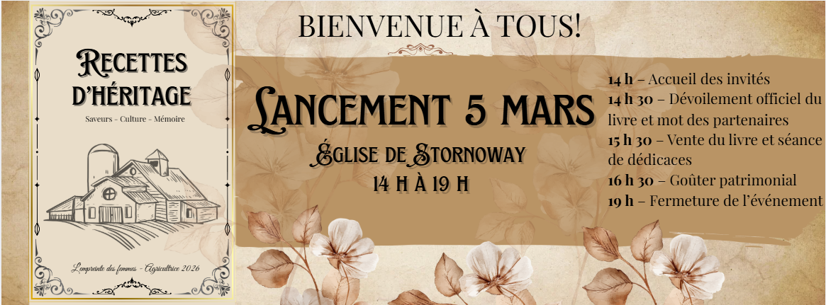 Nous souhaitions vous inviter au lancement du notre livre Recettes d’Héritage – L’empreinte des femmes. Un événement hors du commun, porteur de sens, de mémoire et de transmission - le 5 mars à l'église de Stornoway dès 14 h.