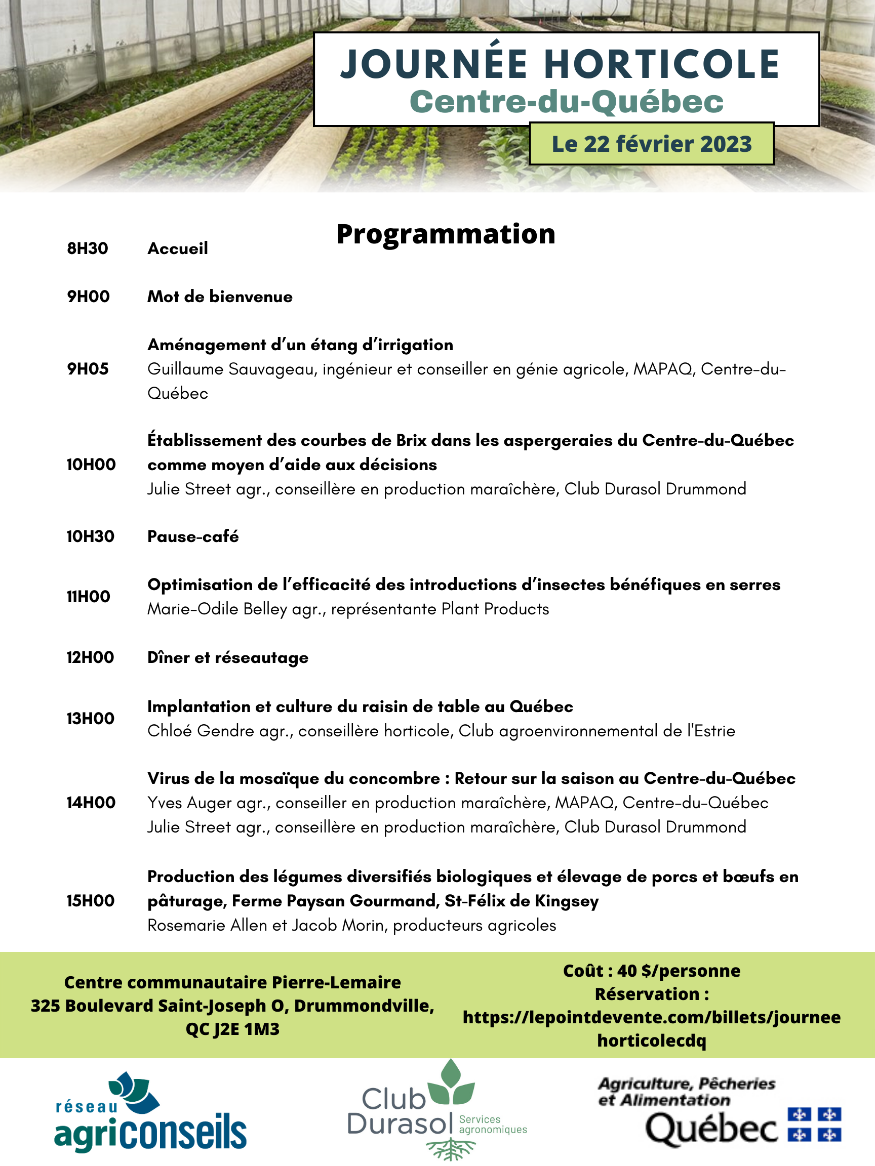 La Journée horticole du Centre-du-Québec est organisée par le Club Durasol Drummond en partenariat avec le ministère de l’Agriculture, des Pêcheries et de l’Alimentation et le Réseau Agriconseils Centre-du-Québec.