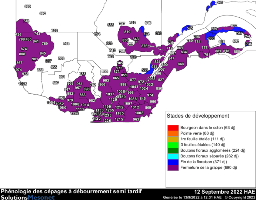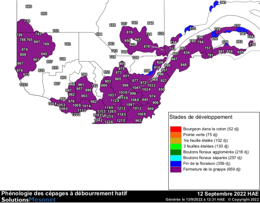 Les raisins poursuivent leur maturation. Sur les sites les plus chauds de la Montérégie, près de 1 250 degrés-jours en base 10 (DJ10) sont maintenant accumulés depuis le 1er mars, jour du début des calculs d'accumulation des degrés-jours. Pour les régions plus fraîches comme le Bas-Saint-Laurent, la Gaspésie et le Saguenay, les accumulations sont autour de 890 DJ10.
