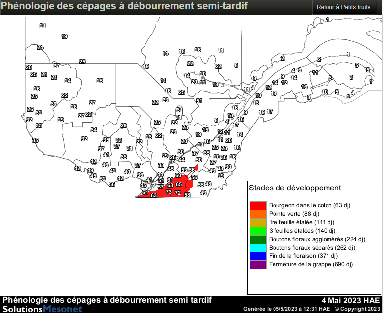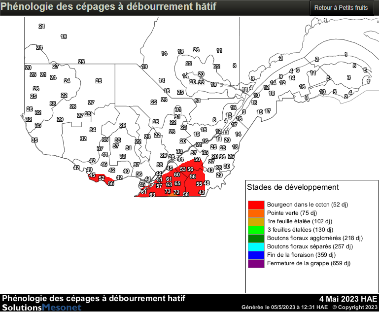 Agrométéo Québec pour un visuel provincial de l'état d'avancement du développement des cépages à débourrement hâtif et semi-tardif ainsi que d'autres modèles bioclimatiques sur la vigne. L'information sera mise à jour régulièrement dès le début du débourrement.