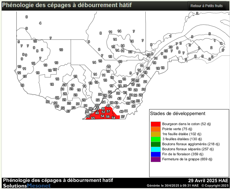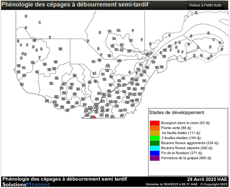 Consultez Agrométéo Québec pour un visuel provincial de l'état d'avancement du développement des cépages à débourrement hâtif et semi-tardif ainsi que d'autres modèles bioclimatiques sur la vigne. L'information sera mise à jour régulièrement dès le début du débourrement.